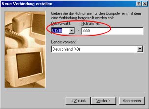 Im folgenden Fenster geben Sie die Ortskennzahl (Vorwahl), Ihre Einwahlnummer und die