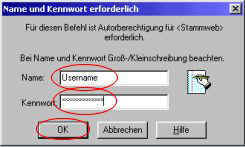 Geben Sie die Zugangsdaten für Ihren Frontpage-Zugang ein und bestätigen Sie die Eingabe mit
